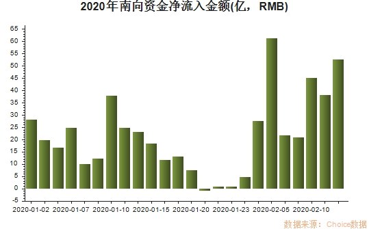 不仅是北向资金,当前的南向资金表现也很惊艳,数据显示,进入2020年后,仅在1月21日净流出0.67亿元,其余交易日均呈净流入状态,累计净流入金额为520.62亿元。