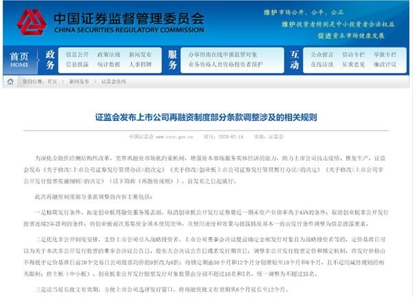 在公开征求意见后的大约三个月后,再融资规则正式发布。2月14日晚间,证监会发布了修改后的《上市公司证券发行管理办法》《创业板上市公司证券发行管理暂行办法》和《上市公司非公开发行股票实施细则》(统称为“再融资新规”)。