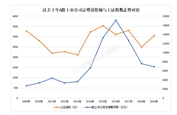 据东方财富Choice数据显示,在2015 -2016年,A股上市公司定增募资额分别达到13327亿元、17118.53亿元的十年高点。相对应地,上证指数在2015-2016年期间也曾迎来一波上涨。
