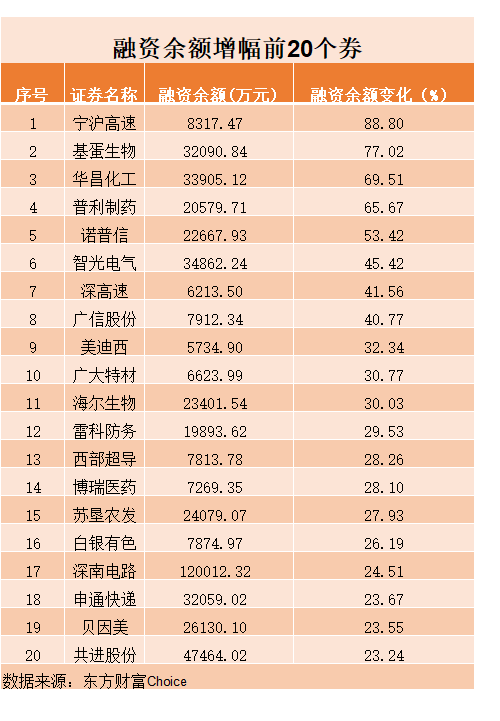 融资余额增幅最大的是宁沪高速,该股最新融资余额8317.47万元,较前一交易日增长88.80%。另外,融资余额增幅较大的还有基蛋生物、华昌化工等,增幅分别达77.02%、69.51%。
