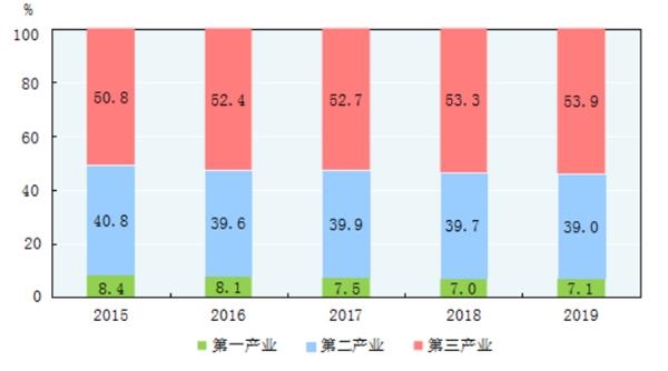 2015-2019年三次产业增加值占国内生产总值比重