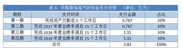 北控清洁能源集团入主后不久,金宇车城以3.83亿元现金对价收购江苏智临电气科技有限公司(简称“智临电气”)55%股权,双方约定分批支付收购款(表3)。