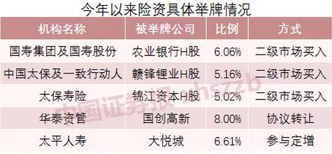 相较于举牌H股公司,险资在A股的举牌目的更加多样。今年1月,太平人寿以定增方式参与大悦城混改,从而实现举牌。华泰资管则动用2.79亿元保险纾困资金受让国创高新约8%股份,以降低国创高新流动性压力。