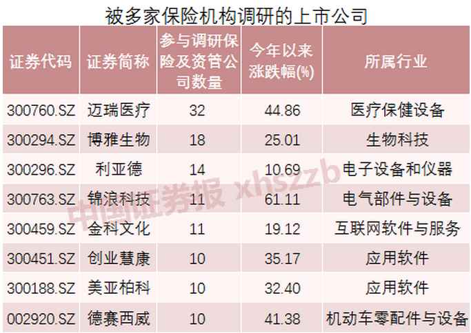 迈瑞医疗、博雅生物和金科文化成为这些调研险资中最看好的企业。数据显示,今年以来,共有超过30家保险公司调研迈瑞医疗,博雅生物有超过20家险资参与调研。