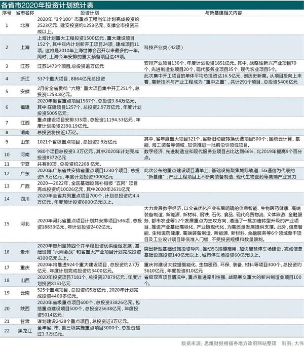 据《企业透明度报告》不完全统计,全国22个已经公布投资计划的省市,累计公布了约47万亿的投资金额,与2019年31个省市的计划投资金额大致相当,上海、江苏、浙江、山东等多个省份强调将推进新基建投资。