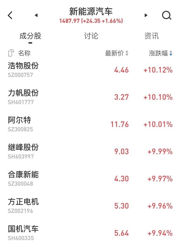4月1日A股开盘,新能源汽车概念股走强。浩物股份(000757,SZ)、力帆股份(601777,SH)、阿尔特(300825,SZ)涨幅超过10%;继峰股份(603997,SH)、方正电机(002196,SZ)等股涨幅超过9%。整车板块中,中国重汽(000951,SZ)涨幅超过6%,众泰汽车(000980)、广汇汽车(600297,SH)、北汽蓝谷(600733,SH)、一汽夏利(000927,SZ)涨幅超过3%。