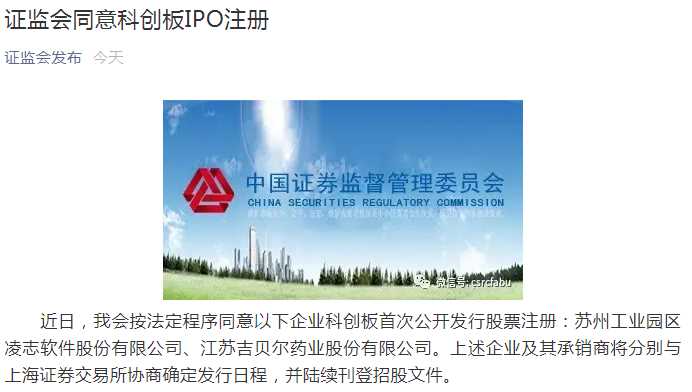 近日,我会按法定程序同意以下企业科创板首次公开发行股票注册:苏州工业园区凌志软件股份有限公司、江苏吉贝尔药业股份有限公司。上述企业及其承销商将分别与上海证券交易所协商确定发行日程,并陆续刊登招股文件。