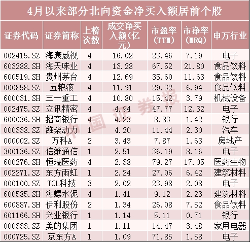 从前十大活跃个股来看,4月以来海康威视北向资金净买入额居首,达16.02亿元;海天味业、贵州茅台、五粮液、三一重工净买入额也均超过10亿元,分别为13.28亿元、12.69亿元、11.91亿元、10.80亿元;立讯精密、招商银行、潍柴动力北向资金净买入额也均超过4亿元。