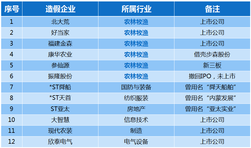 在上述造假案例中,有6家涉事企业属于农林牧渔行业,包括北大荒、山东好当家、福建金森、康华农业、参仙源以及振隆股份。除了撤回IPO申请最终没有成功上市的振隆股份以及新三板的参仙源,其余四家均为上市公司。根据证监会行业分类,目前农林牧渔行业一共有46家上市公司。因此,2016年农林牧渔行业中有高达10.87%的上市公司因为财务造假而被证监会进行行政处罚。此外,除了好当家以外,其余5家公司的财务作假全部涉及虚增收入。