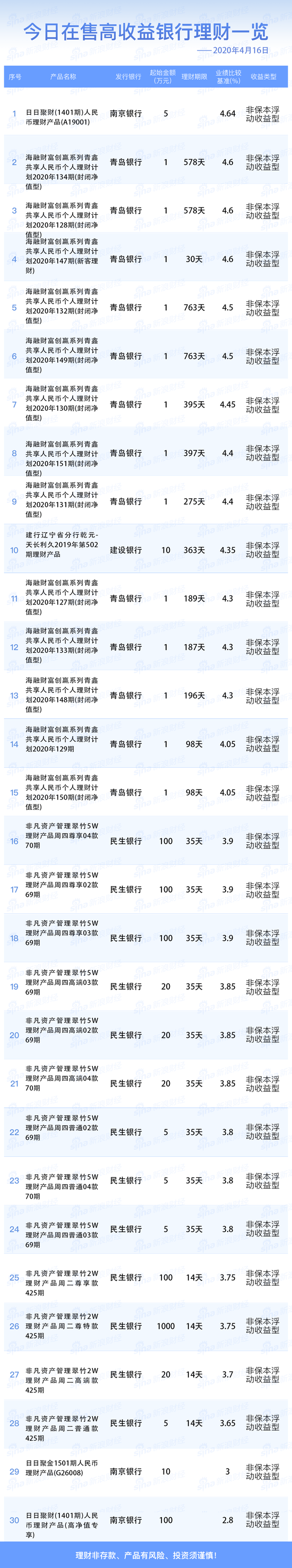 4月16日在售高收益银行理财产品:今日在4.5%以上的银行人民币理财产品共4款。南京银行(7.470, -0.02, -0.27%)的“日日聚财(1401期)人民币理财产品(A19001)”业绩比较基准最高为4.64%。