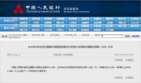 4月20日,全国银行间同业拆借中心公布了最新贷款市场报价利率(LPR)——1年期LPR为3.85%,较上月下调20个基点;5年期以上LPR为4.65%,较上月下调10个基点。