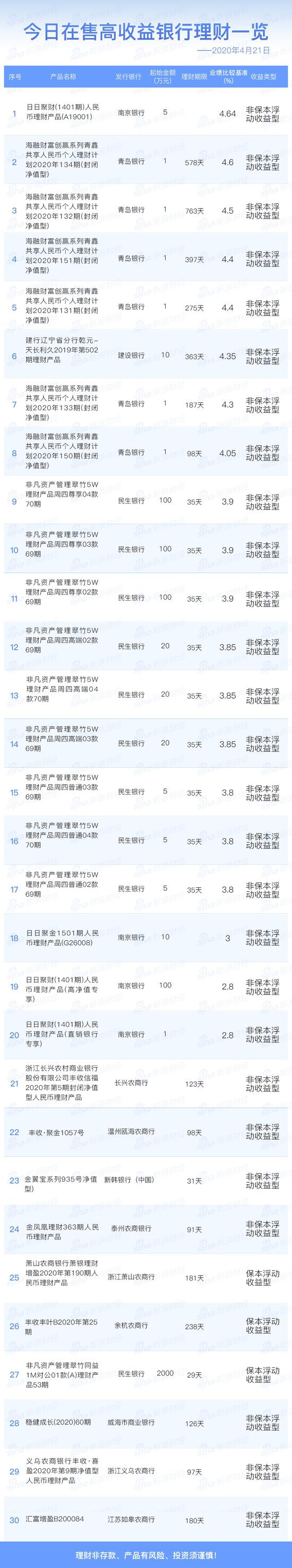 4月21日在售高收益银行理财产品一览