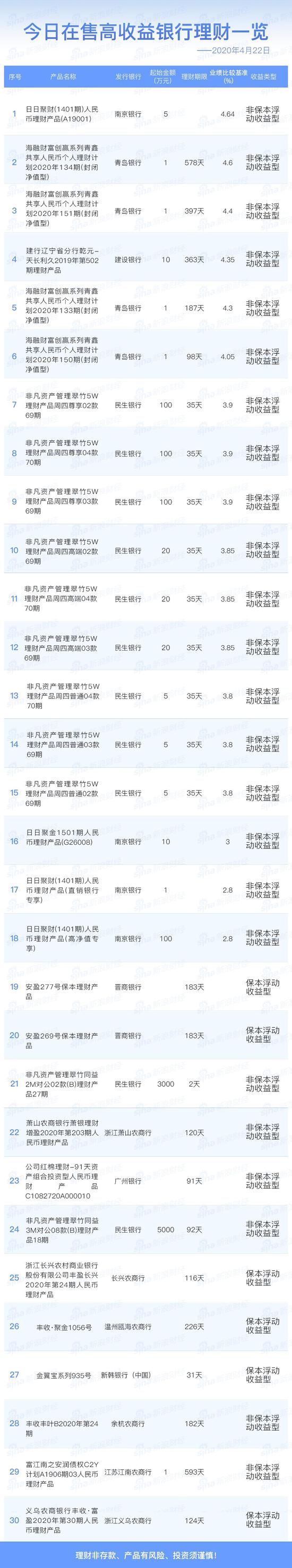 4月22日在售高收益银行理财产品:今日业绩比较基准在4.6%以上的银行人民币理财产品共两款。南京银行(7.390, -0.03, -0.40%)的“日日聚财(1401期)人民币理财产品(A19001)”业绩比较基准最高,为4.64%。
