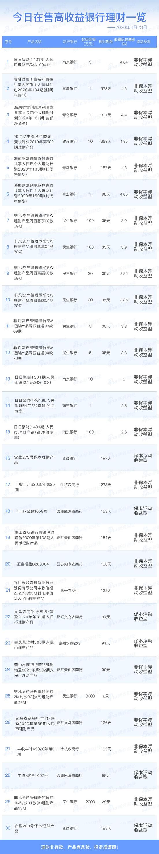 4月23日在售高收益银行理财产品:今日业绩比较基准在4.6%以上的银行人民币理财产品共两款。南京银行(7.350, -0.02, -0.27%)的“日日聚财(1401期)人民币理财产品(A19001)”业绩比较基准最高,为4.64%。