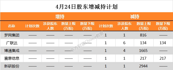 4月24日,两市共有5家公司公告股东减持计划,包括广联达、新研股份等。