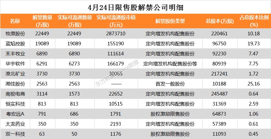 4月24日,两市共有11家公司限售股解禁,具体解禁公司包括牧原股份、蓝焰控股等。其中牧原股份实际解禁可流通股数量为22449万股,占其总股本比例为10.18%。