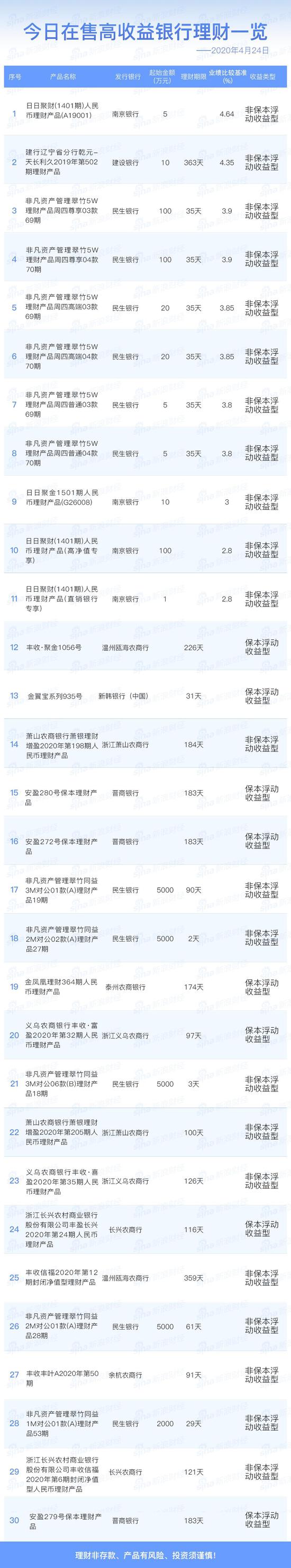 4月24日在售高收益银行理财产品一览