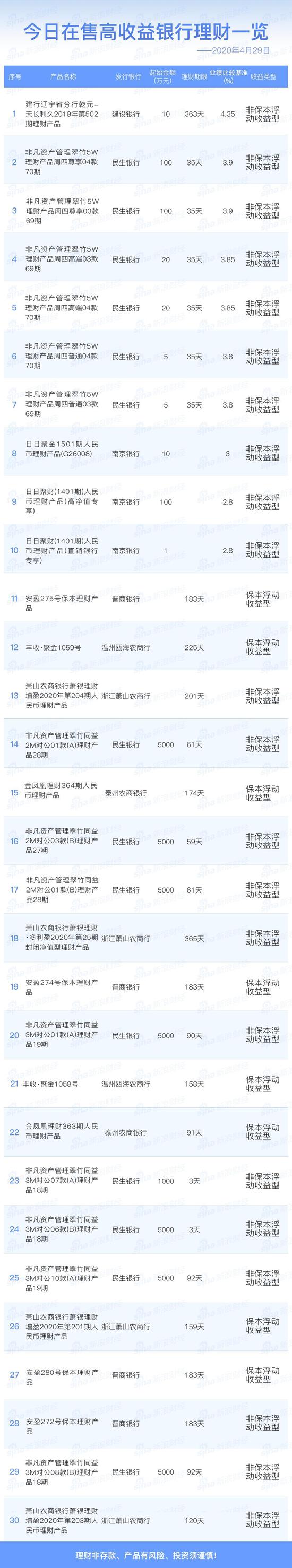4月29日在售高收益银行理财产品:今日业绩比较基准在4.00%以上的银行人民币理财产品有一款,是建设银行(6.380, 0.11, 1.75%)的“建行辽宁省分行乾元-天长利久2019年第502期理财产品”,业绩比较基准为4.35%。