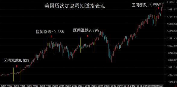 下图显示,从2015年底美联储加息至今,道琼斯指数已经上涨了17%多,而前几轮加息周期中,美股大多保持区间震荡态势。