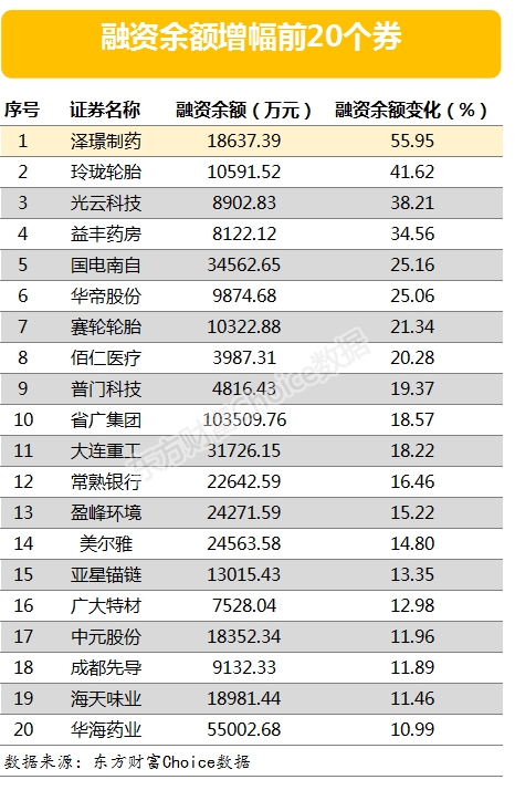 融资余额增幅最大的是泽璟制药,该股最新融资余额18637.39万元,较前一交易日增长55.95 %。另外,融资余额增幅较大的还有玲珑轮胎、光云科技等,增幅分别达41.62 %、38.21 %。
