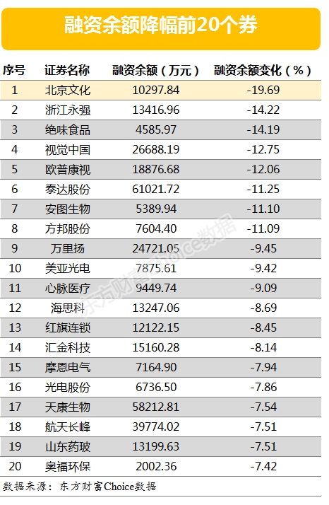 以下为当天融资余额降幅最大的20只个券: