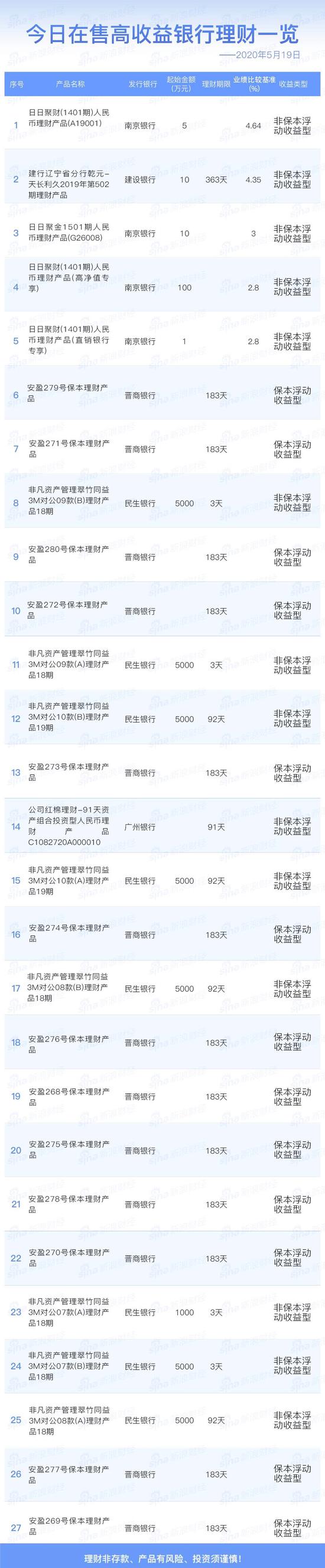 5月19日在售高收益银行理财产品:今日业绩比较基准在4.6%以上的银行人民币理财产品共1款。南京银行(7.690, 0.04, 0.52%)的“日日聚财(1401期)人民币理财产品(A19001)”业绩比较基准最高,为4.64%。