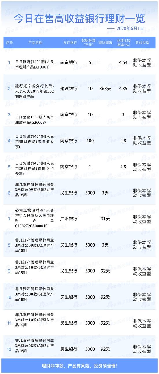 6月1日在售高收益银行理财产品:今日业绩比较基准在4.6%以上的银行人民币理财产品共1款。南京银行(7.900, 0.00, 0.00%)的“日日聚财(1401期)人民币理财产品(A19001)”业绩比较基准最高,为4.64%。