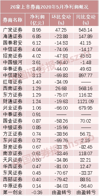 从净利润指标看,2020年5月26家上市券商累计实现净利润53.46亿元;从单家情况看,净利润超过1亿元的便有13家,占到总数的一半。
