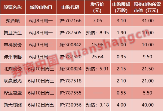 杭州聚合顺新材料股份有限公司(简称“聚合顺”,申购代码:707166)同样于6月8日进行网上/网下申购,申购价格7.05元,单一账户申购上限3.1万股,网上顶格申购需配市值31万元。