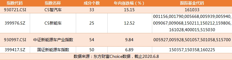与新能源车相关的指数大致有四个,分别是中证指数系列的CS新能车,CS智汽车和新能源车,以及国证指数系列的国证新能车,其中,年内收益最高的是CS智汽车,跟踪基金最多的是CS新能车指数。