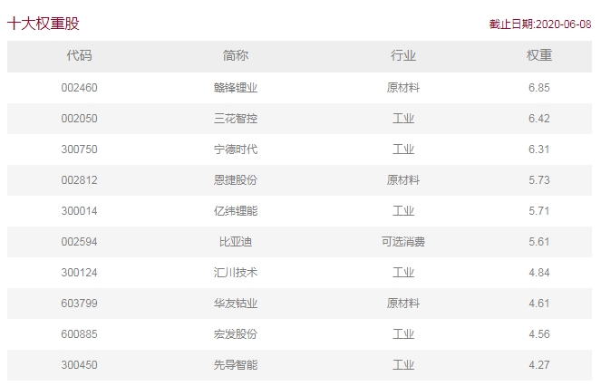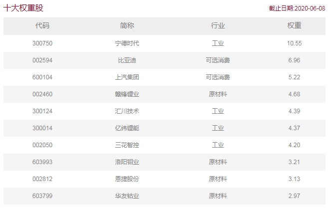 国证新能源汽车指数反映了新能源汽车产业的整体运行情况,向市场提供细分行业指数化投资标的。其十大权重股如下:
