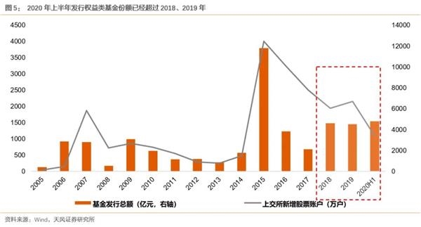 据天风证券统计,尽管年度新增投资者数量远低于2016年、2017年,但2018年、2019年权益类基金发行规模却远高于2016和2017年,进入到发行的高峰期。2020年这种趋势更加显著, 1至5月新增投资者数量大概是2019年的一半,但权益类基金的发行规模却已经超过了2019年。