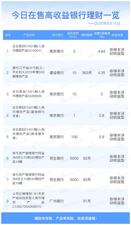 6月15日在售高收益银行理财产品:今日业绩比较基准在4.6%以上的银行人民币理财产品共1款。南京银行(7.700, -0.03, -0.39%)的“日日聚财(1401期)人民币理财产品(A19001)”业绩比较基准最高,为4.64%。