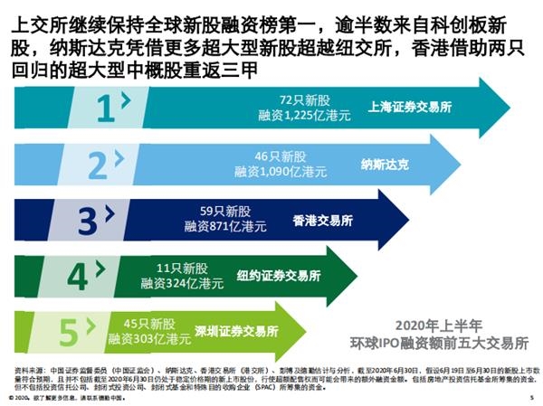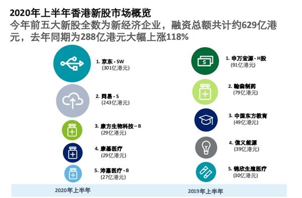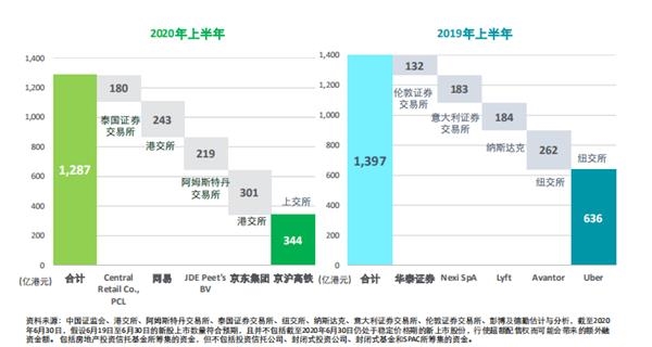 在上半年的IPO中,京沪高铁融资额达314亿元,居全球第一,京东、网易的二次上市紧随其后。不过,今年上半年前五大融资总额较去年同期下降8%,反映疫情对环球超大型新股上市不利。