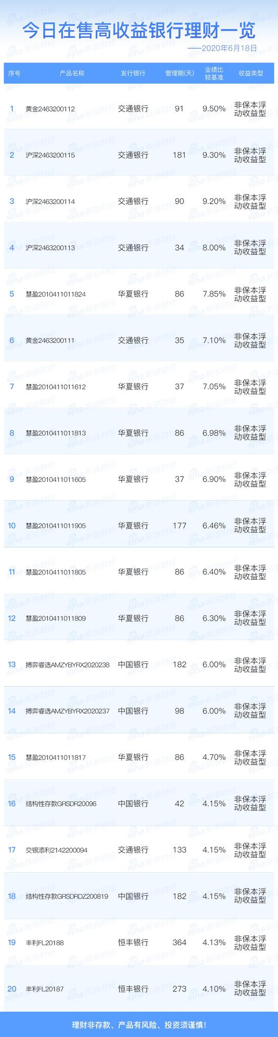 6月18日在售高收益银行理财产品一览