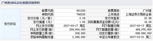 中国证券网讯根据交易所公告,广州港股份有限公司于2017年3月17日进行网上和网下申购。公司本次发行股份数量为69,868万股,回拨机制启动前,网下初始发行数量为48,907.6万股,占本次发行数量的70.00%;网上初始发行数量为20,960.4万股,占本次发行总量的30.00%。