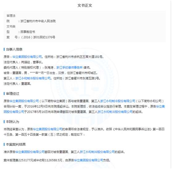 天眼查显示,2017年4月,上诉人童建国因与被上诉人华立集团、原审第三人永和股份合同纠纷一案,不服杭州市中级人民法院作出的民事裁定,向浙江省高级人民法院提起上诉。