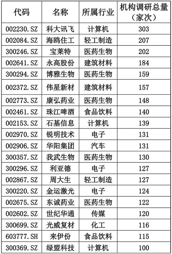 Choice数据显示,6月共有369家上市公司披露了投资者调研情况,其中有20家公司的接待的机构调研总量破百。从行业分布来看,医药生物板块仍然颇受机构青睐,此外计算机、电子、食品饮料、建筑材料、轻工制造等板块也有不少个股被机构扎堆调研。