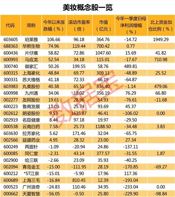作为“网红直播带货”最重要的品种之一,美妆产品也随着网红经济的大热而大卖,相关上市公司的市值也水涨船高。珀莱雅最新市值364.76亿元,今年以来上涨了107%,华熙生物、御家汇、上海家化的涨幅也都在50-80%之间。