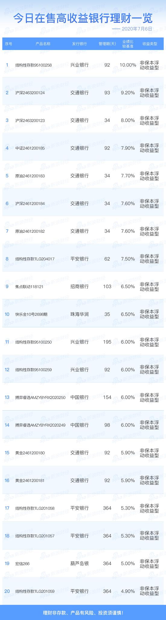 7月6日在售高收益银行理财产品:今日业绩比较基准在8%及以上的银行人民币理财产品共3款。兴业银行(18.630, 1.66, 9.78%)的“结构性存款95100258”业绩比较基准最高,为10.00%。