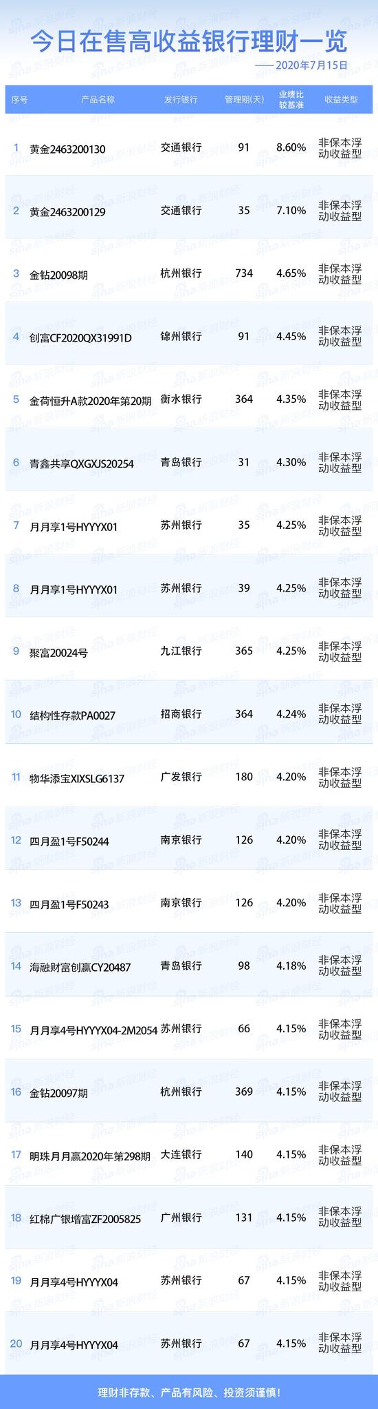 7月15日在售高收益银行理财产品:今日业绩比较基准在8.0%及以上的银行人民币理财产品共1款。交通银行(4.960, -0.07, -1.39%)的“黄金2463200130”业绩比较基准最高,为8.60%。
