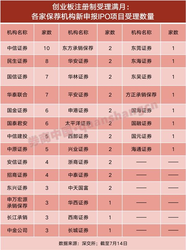 根据券商中国记者统计,在新申报创业板项目的受理数据当中,中信证券仍然第一,共有10家;民生证券排名第二,有8家;国信证券与华泰联合各有7家。国金证券与国泰君安分别有6家;中信建投与中原证券均有5家。