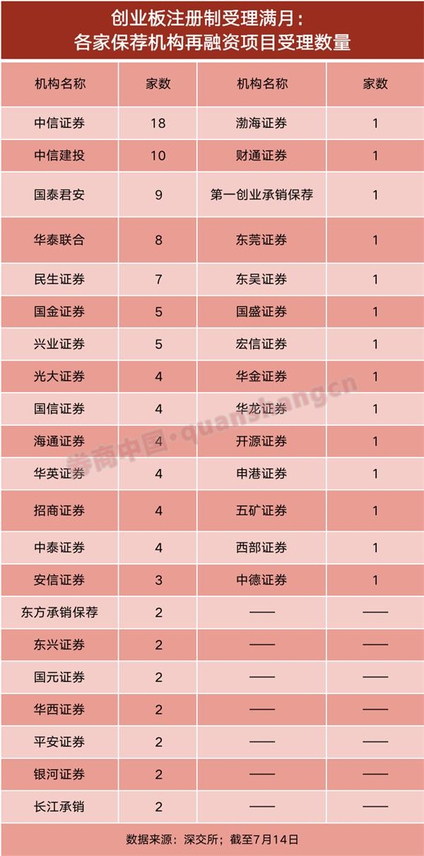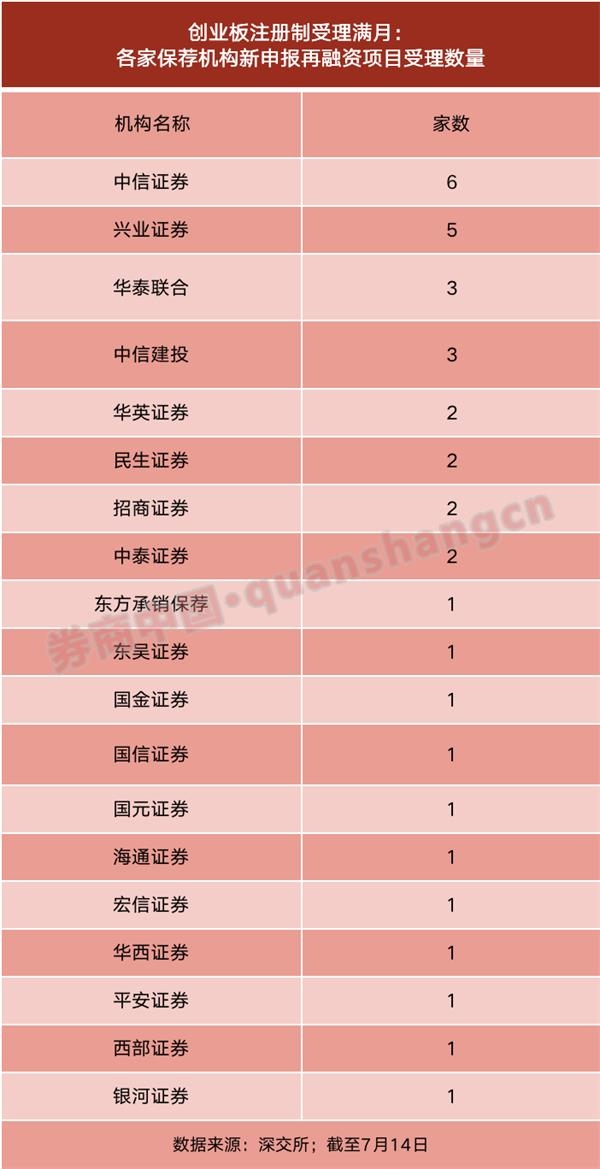 新创业板再融资类中,截至7月14日,深交所共受理117单项目,其中81单定增,36单可转债。一般而言,再融资项目储备情况不仅体现券商投行的上市公司资源,也体现投行后续服务能力,毕竟IPO对很多发行人而言尚属首次涉足资本市场。