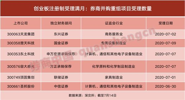 事实上,上述数据中包含了在审企业数量。而新项目的申报更能体现投行项目最新的储备实力以及发展潜力。据了解,截至7月14日,从证监会顺利平移到深交所的创业板项目有176家;新申报项目获得受理的有107家。