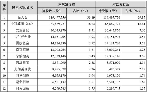 本次发行前,公司控股股东陈天石直接持有公司33.19%的股份,并作为艾溪合伙的执行事务合伙人控制艾溪合伙持有公司8.51%的股份,间接持股1.16%,陈天石合计控制公司41.71%的股份,为公司的实际控制人,陈天石直接和间接合计持股约34.36%。以发行后股份来估算,陈天石直接和间接持有寒武纪发行后股份比例合计约为30.92%,以861亿市值来计算,其持股市值达到266亿元。