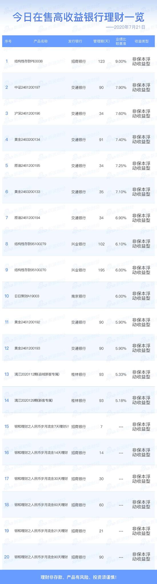 7月21日在售高收益银行理财产品一览