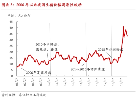 国内猪价长期呈现周期性波动,对物价及生产生活带来深刻影响。东证期货研报指出,我国生猪价格从2006年以来形成了四轮周期性波动,疫病或环保等原因带来生猪产能大幅度减少是形成一轮周期的主要动因。