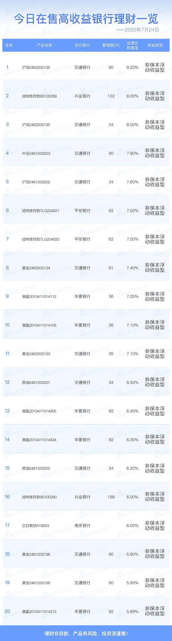 7月24日在售高收益银行理财产品一览