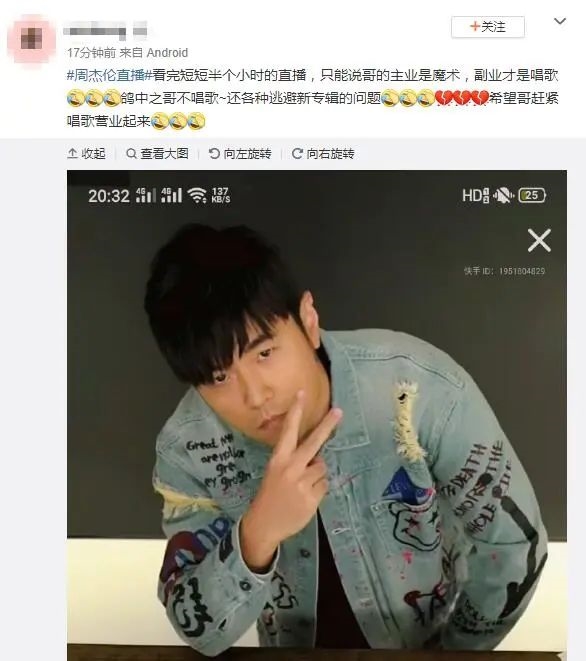 20:30,周杰伦在快手上开启了自己的首次直播。