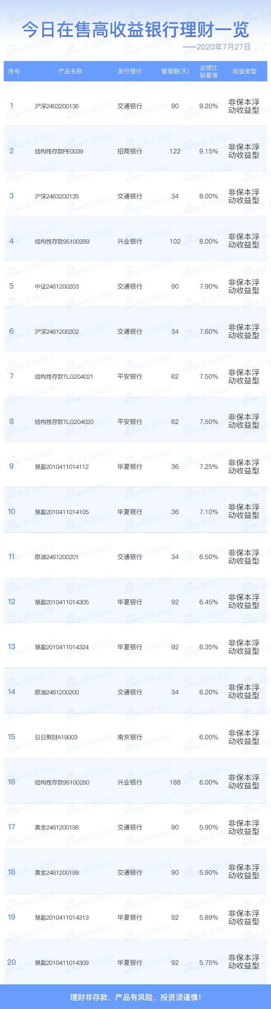 7月27日在售高收益银行理财产品:今日业绩比较基准在9.0%及以上的银行人民币理财产品共2款。交通银行(4.770, 0.00, 0.00%)的“沪深2463200136”业绩比较基准最高,为9.20%。